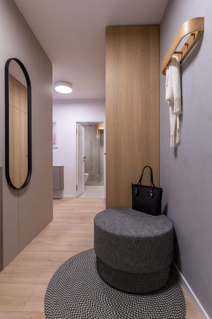 Kompletní rekonstrukce městského bytu podle návrhu Dobrého interiéru udělala z dvoupokojového bytu místo vyhovující moderním nárokům a zohlednila i specifické požadavky majitelů jako je infrasauna. I když místnosti plní více účelů zároveň, všechny propojují kašmírové odstíny: ložnice s pracovnou, hlavní obytný prostor a chodba tak působí jako jeden vzdušný celek. Béžové kontrastuje zelený odstín židlí AAC od HAY a tmavě červená lampa Suspence od Fritz Hansen. K té také hezky ladí koberec Oona od Normann Copenhagen.