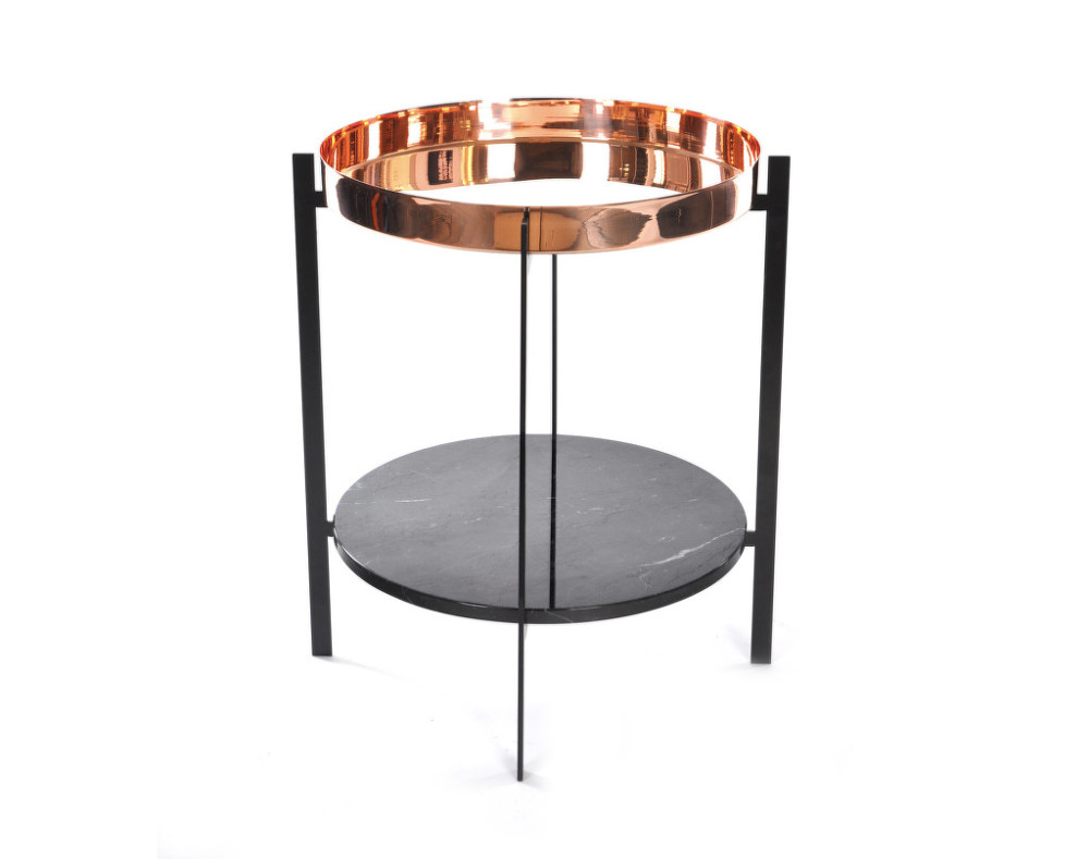 Odkládací stolek Deck s podnosem v měděném provedení a spodní deskou z černého mramoru.