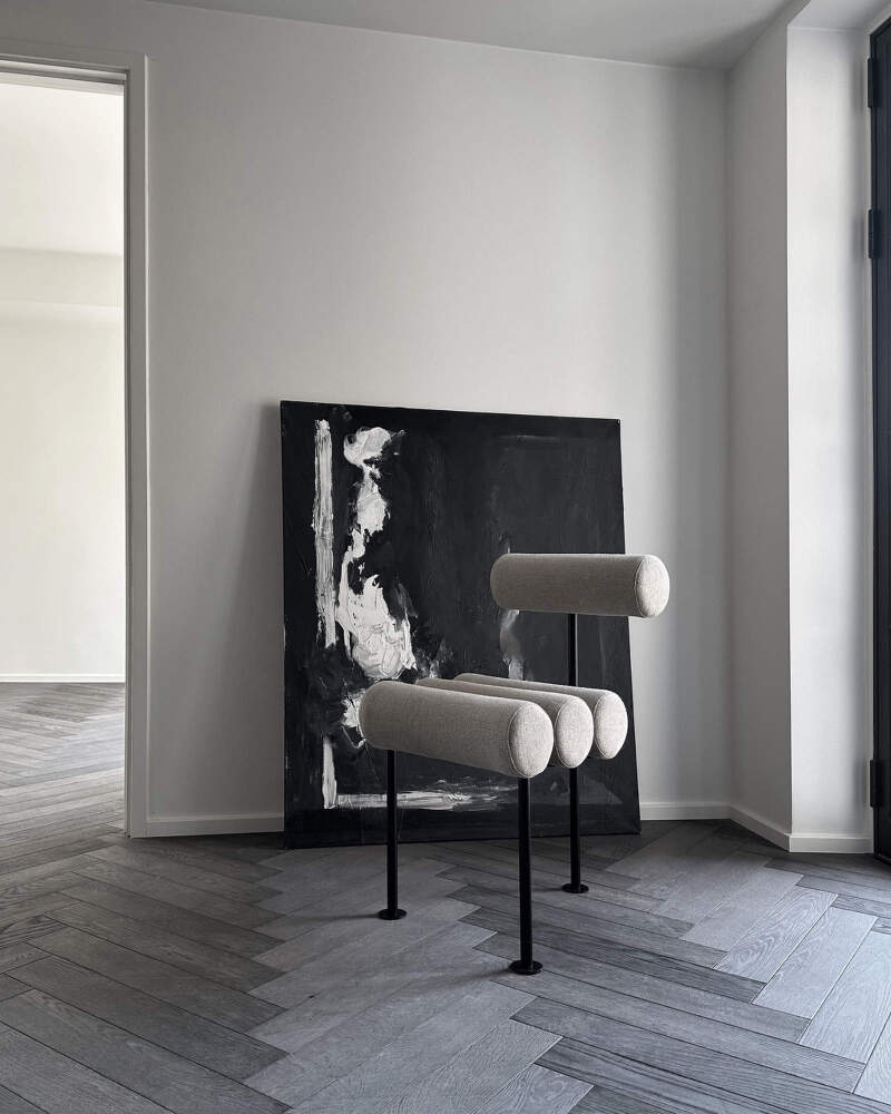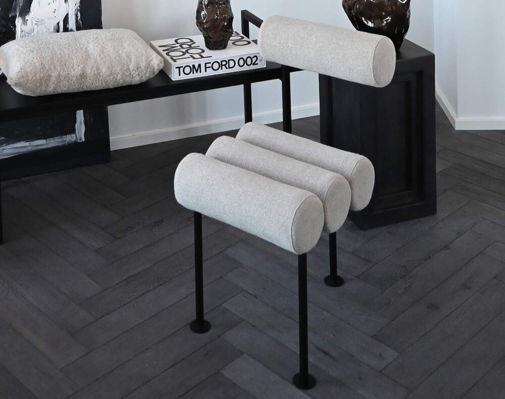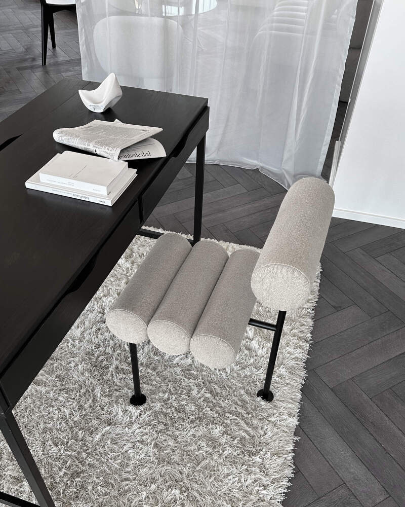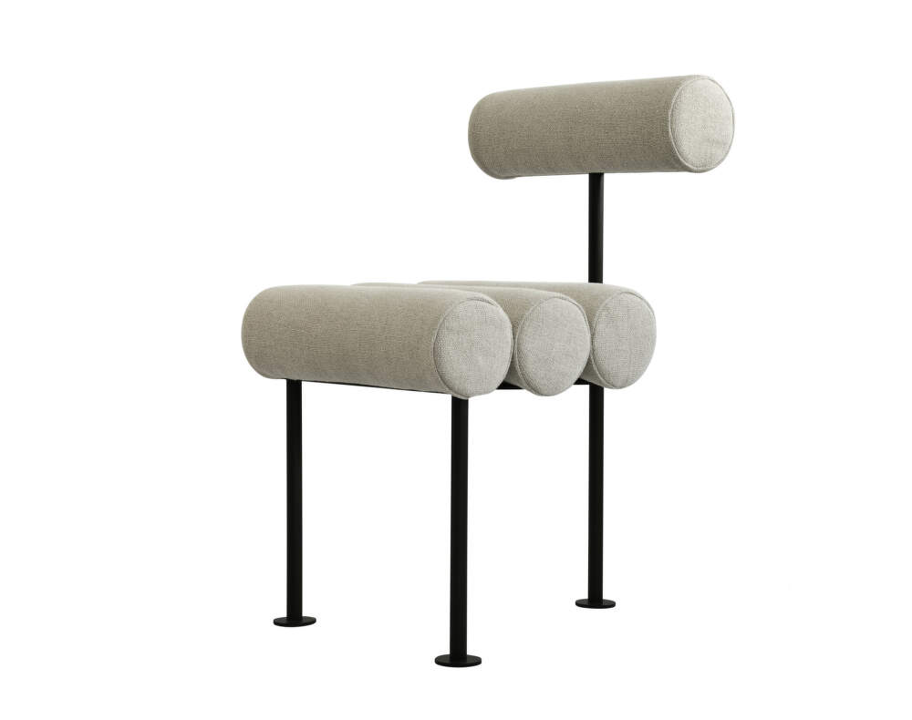 Každý detail je promyšlený s ohledem na rovnováhu mezi tvarem, materiálem a komfortem. Rám tvoří práškově lakovaná konstrukce, doplněná o čalouněný sedák a opěrku z lněné látky. Použité materiály podtrhují kvalitu zpracování a dodávají židli příjemný hmatový charakter.