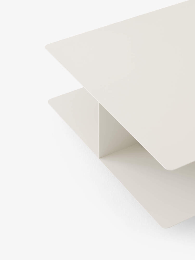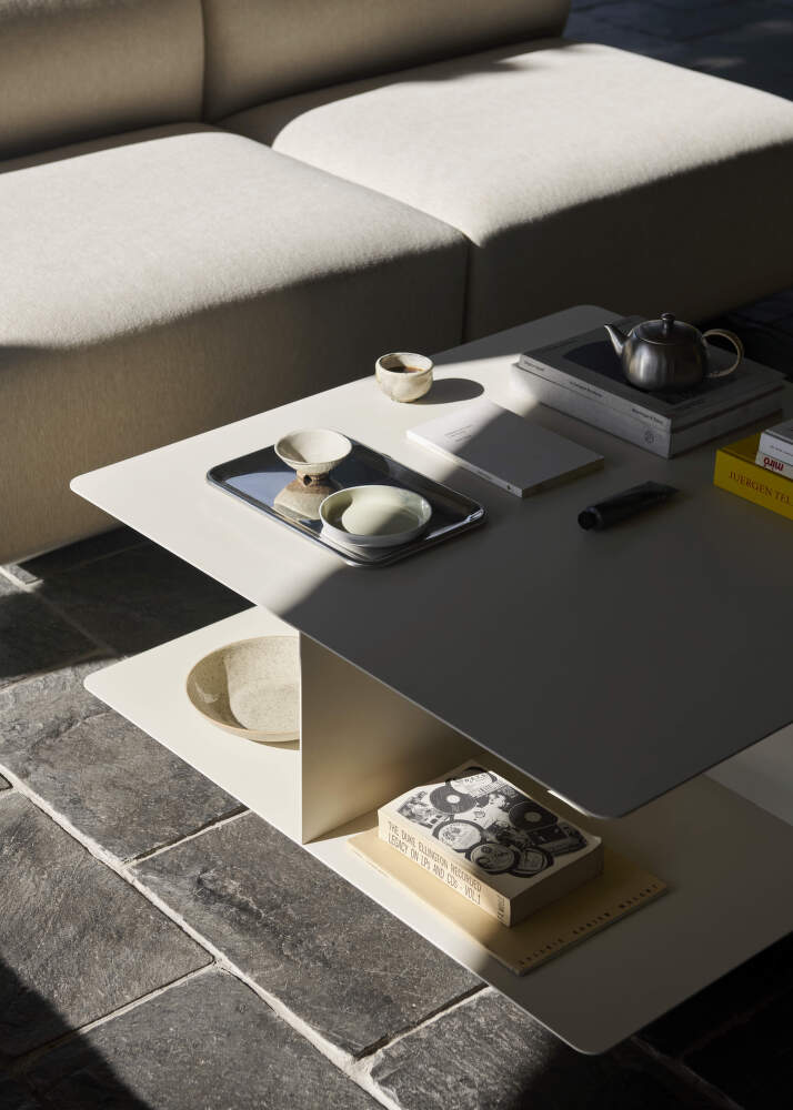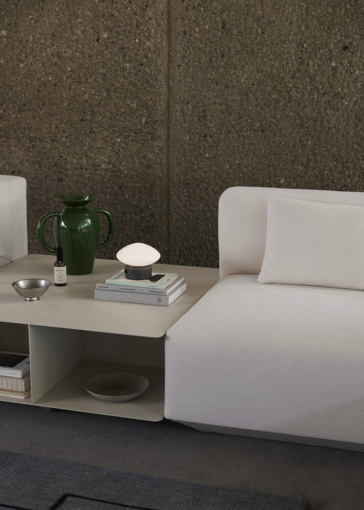 Stolek Develius je vyroben z přesně tvarované oceli s jemně strukturovanou práškovou povrchovou úpravou. Elegantně čistá konstrukce působí nenápadně, přesto nabízí výrazný užitný komfort. Integrovaný úložný prostor je přístupný ze všech stran a zůstává částečně skrytý, takže pomáhá udržet klidný a uspořádaný vzhled obytného prostoru.