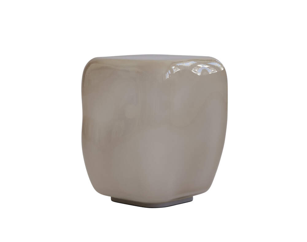 Stolek je vyroben foukáním roztaveného skla do formy a následným ručním dokončením. Tento proces vytváří drobné vzduchové bublinky, barevné nuance a organické nepravidelnosti, které jsou charakteristickým znakem ruční výroby. Vnitřní strana skla je jemně barvena, aby vznikl hluboký, rovnoměrný odstín, aniž by zanikla průsvitnost materiálu.