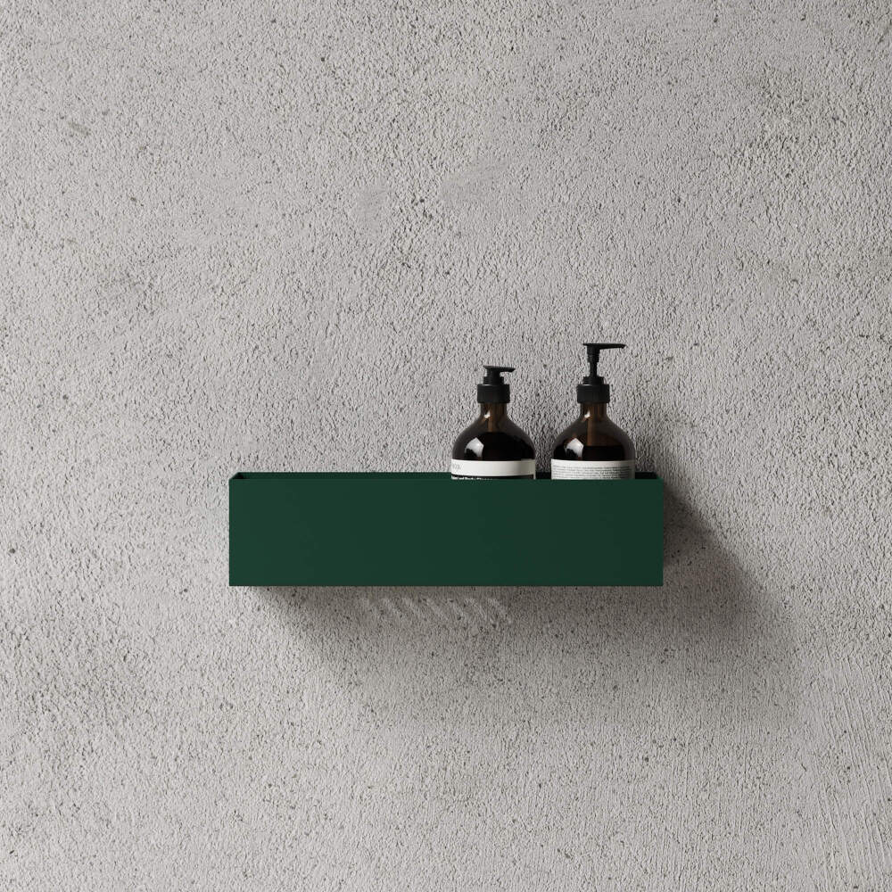 Minimalistická odkládací police Bath Shelf od značky Nichba v zeleném provedení.