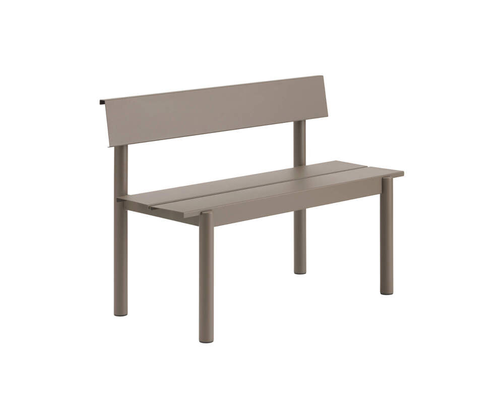 Menší ocelová lavice Linear Steel Bench s opěrkou z kolekce moderního venkovního nábytku, kterou pro dánskou značku Muuto navrhnul designér Thomas Bentzen. Provedení: hnědošedá.