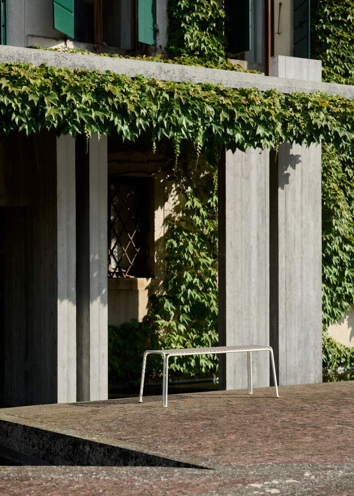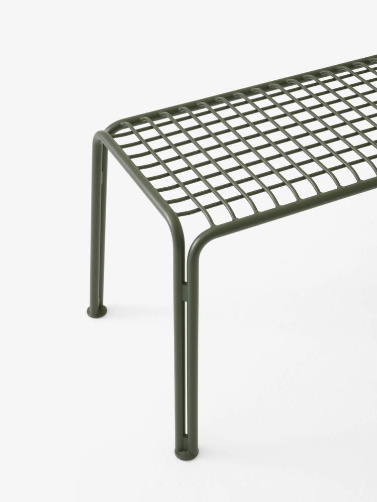 Zahradní lavice z odolné oceli Thorvald SC112 od dánské značky &Tradition navržená studiem Space Copenhagen. Provedení: zelená.