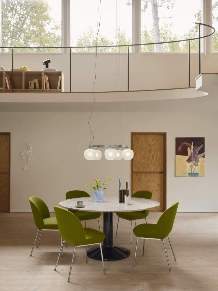 Lustr Rime rozvíjí charakteristický design kolekce do výrazné, prostorově působivé podoby. Pět ručně foukaných skleněných stínítek vytváří vyváženou kompozici, která funguje nejen jako zdroj světla, ale také jako dominantní prvek interiéru. Svítidlo přináší měkké, rovnoměrně rozptýlené světlo a zároveň působí jako elegantní světelná instalace.