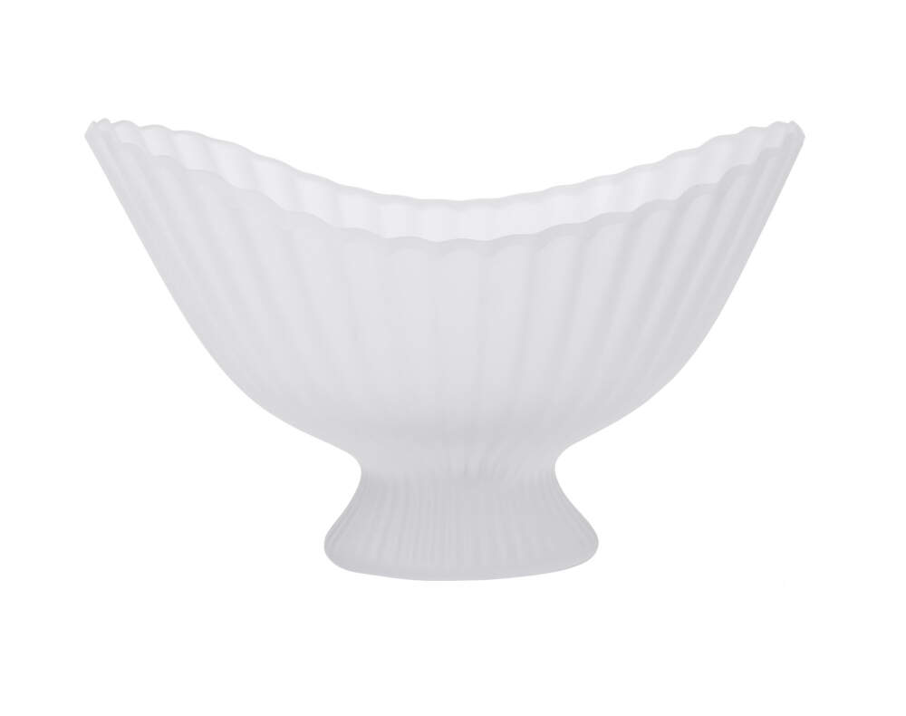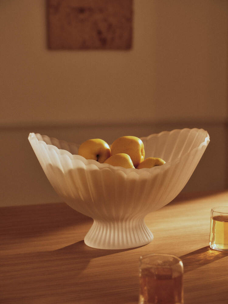 Mísa je vyrobena z ručně foukaného skla v provedení frosted, které není zcela průhledné a jemně propouští světlo. Díky tomu působí lehce a přirozeně vynikne jako dekorativní prvek v interiéru.