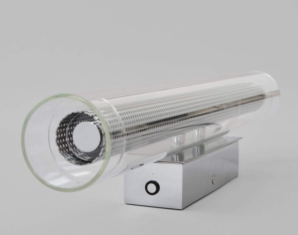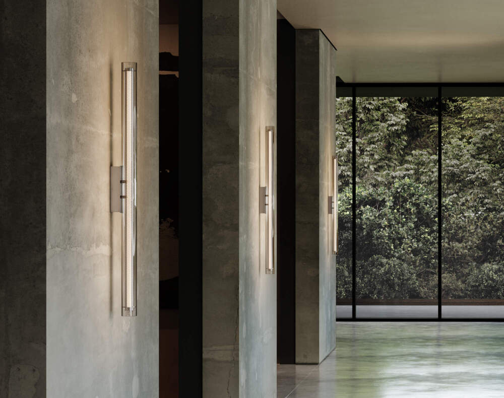 Nástěnná lampa Frame pracuje s myšlenkou rámování světla pomocí vrstev materiálů, které vytvářejí výrazný, ale zároveň jemný světelný efekt. Perforovaný kov dodává lampě lehký industriální charakter, zatímco vnější válcová vrstva z čirého skla jej opticky zjemňuje a podtrhuje plynulost celého tvaru. Kontrast mezi ostřeji strukturovaným kovem a hladkým sklem vytváří vizuální rovnováhu typickou pro celou kolekci.