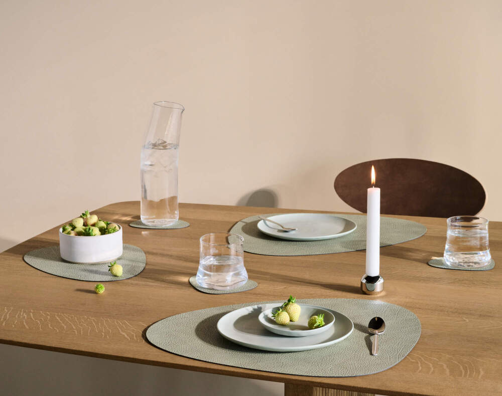 Dodejte svému stolu šmrnc a eleganci ikonickým prostíráním a podložkami pod skleničky od značky Lind DNA. Nejen líbivé, ale i ekologicky šetrné podložky vyrobené z recyklované kůže OEKO-TEX® byly předtím, než se staly praktickým doplňkem každého jídelního stolu, nadprodukcí vzniklou při výrobě bot, tašek a opasků. Nyní jsou v organickém tvaru k dispozici s různou strukturou povrchu a v několika barevných provedeních. Dokonalou harmonii vytvoří zejména v kombinaci se stejně tvarovaným prostíráním a nádobím z kolekce Curve.