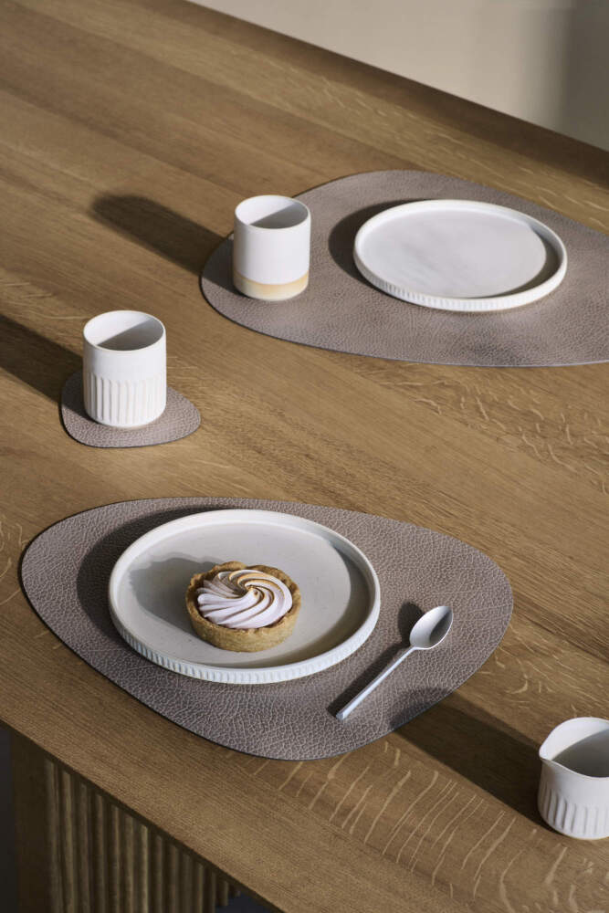 Dodejte svému stolu šmrnc a eleganci ikonickým prostíráním a podložkami pod skleničky od značky Lind DNA. Nejen líbivé, ale i ekologicky šetrné podložky vyrobené z recyklované kůže OEKO-TEX® byly předtím, než se staly praktickým doplňkem každého jídelního stolu, nadprodukcí vzniklou při výrobě bot, tašek a opasků. Nyní jsou v organickém tvaru k dispozici s různou strukturou povrchu a v několika barevných provedeních. Dokonalou harmonii vytvoří zejména v kombinaci se stejně tvarovaným prostíráním a nádobím z kolekce Curve.