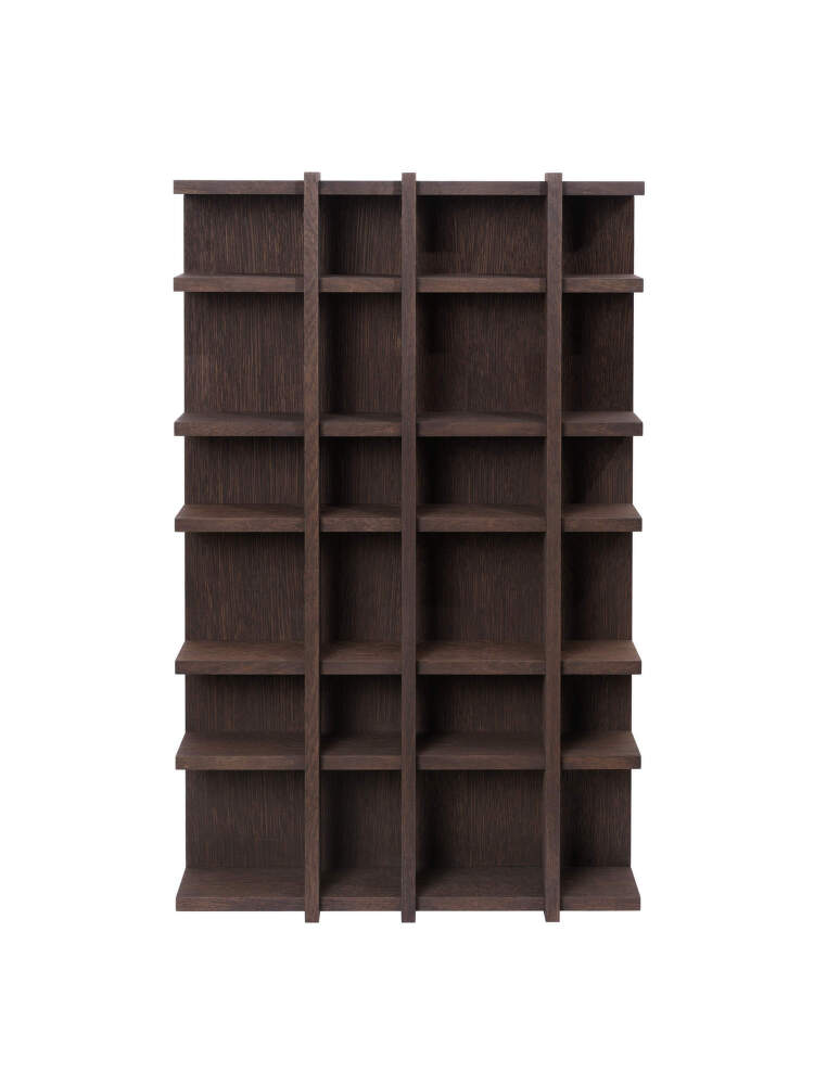 Vysoká dřevěná police Tilem 4x6 od dánské značky Ferm Living. Provedení: tmavě mořený dub.