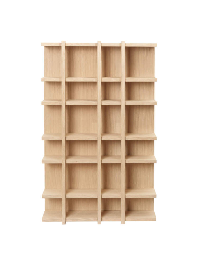 Vysoká dřevěná police Tilem 4x6 od dánské značky Ferm Living. Provedení: přírodní dub.