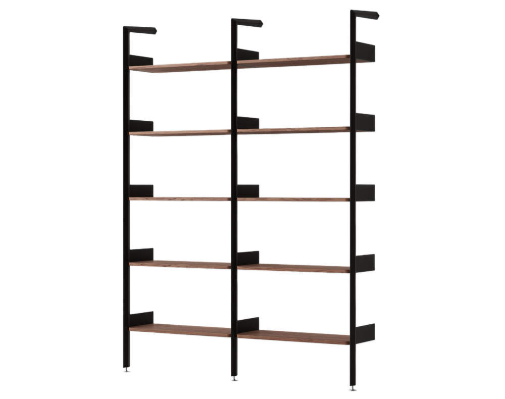 Minimalistická policová sestava Rombe v konfiguraci A (IF1+IF4), kterou pro dánskou značku &Tradition navrhlo studio Industrial Facility. Provedení: antracitové konzole, police z lakovaného ořechu.