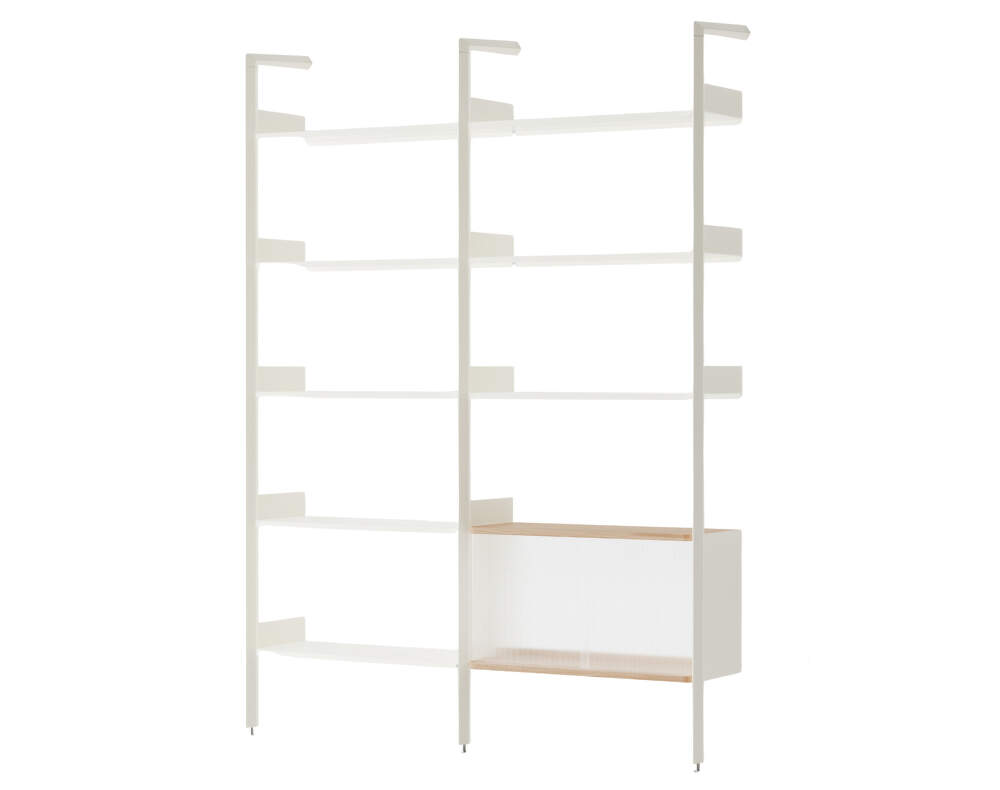 Minimalistická policová sestava Rombe v konfiguraci C (IF1+IF6) se skříňkou, kterou pro dánskou značku &Tradition navrhlo studio Industrial Facility. Provedení: alabastrové konzole a police.