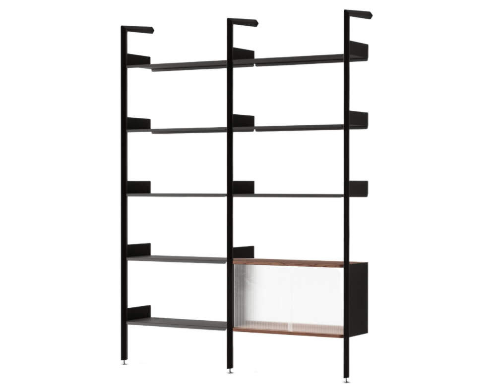 Rombe v konfiguraci C spojuje otevřené police s uzavřenou skříňkou opatřenou posuvnými dveřmi z rákosového skla, které propouštějí světlo, ale zároveň zajišťují decentní krytí uložených předmětů. Skvěle se hodí do obývacího pokoje, kde nabídne prostor jak pro vystavení, tak pro skrytí věcí, které nemají být na očích.