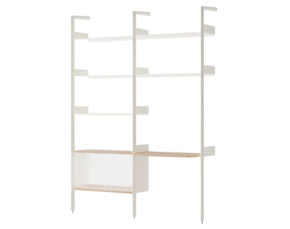 Minimalistická policová sestava Rombe v konfiguraci D (IF3+IF5) s pracovní deskou a skříňkou, kterou pro dánskou značku &Tradition navrhlo studio Industrial Facility. Provedení: alabastrové konzole a police, deska z lakovaného dubu.