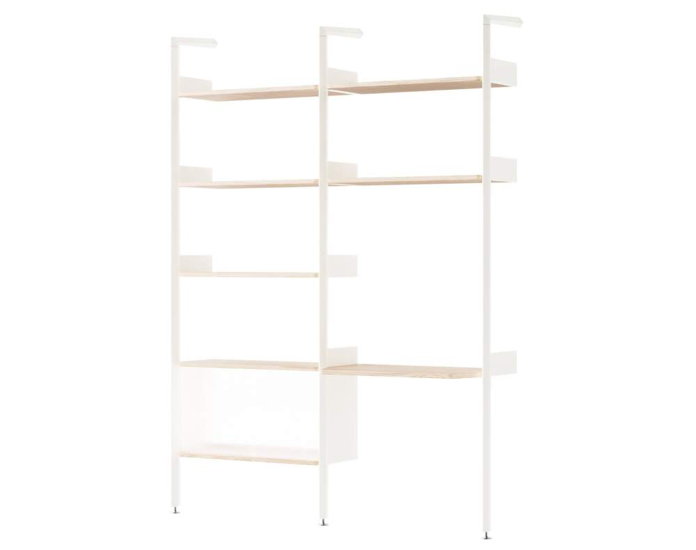Rombe v konfiguraci D kombinuje klasické policové řešení s integrovaným stolkem, což z něj činí ideální volbu pro domácí kanceláře nebo kreativní pracovní kouty. Součástí je také skříňka opatřená posuvnými dveřmi z rákosového skla, které propouštějí světlo, ale zároveň zajišťují decentní krytí uložených předmětů. Tato varianta umožňuje plynulé propojení úložného prostoru a pracovní plochy v jednom celku.