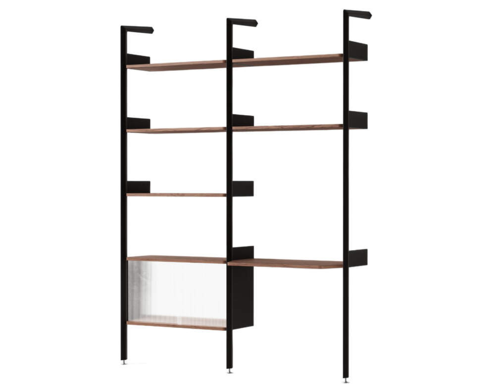 Rombe v konfiguraci D kombinuje klasické policové řešení s integrovaným stolkem, což z něj činí ideální volbu pro domácí kanceláře nebo kreativní pracovní kouty. Součástí je také skříňka opatřená posuvnými dveřmi z rákosového skla, které propouštějí světlo, ale zároveň zajišťují decentní krytí uložených předmětů. Tato varianta umožňuje plynulé propojení úložného prostoru a pracovní plochy v jednom celku.