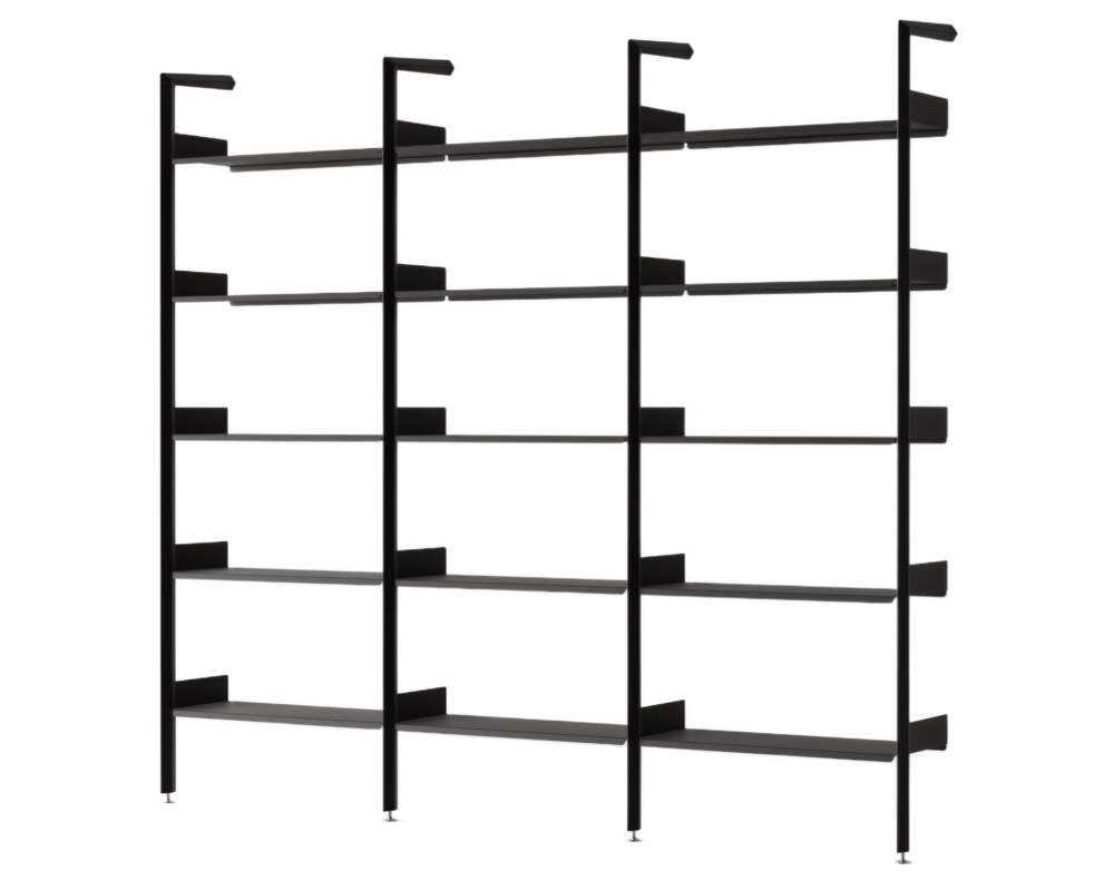 Minimalistická policová sestava Rombe v konfiguraci F (IF1+IF4+IF4), kterou pro dánskou značku &Tradition navrhlo studio Industrial Facility. Provedení: antracitové konzole a police.