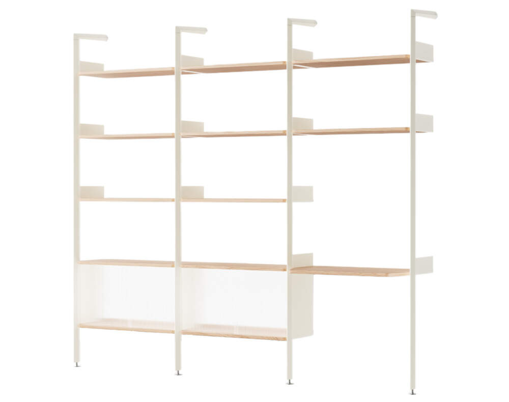 Rombe v konfiguraci J spojuje otevřené police s uzavřenými skříňkami opatřenými posuvnými dveřmi z rákosového skla, které propouštějí světlo, ale zároveň zajišťují decentní krytí uložených předmětů. Součástí je také integrovaný stolek, což z této sestavy činí ideální volbu pro domácí kanceláře nebo kreativní pracovní kouty. Tato varianta umožňuje plynulé propojení úložného prostoru a pracovní plochy v jednom celku.