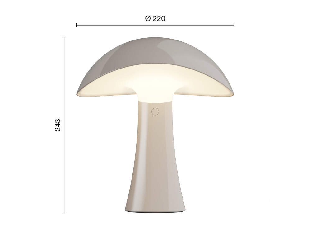 Lampa kombinuje měkké, rozptýlené světlo s odolnou konstrukcí z vstřikovaného polymeru. Je vybavena třístupňovým stmíváním (10 % / 33 % / 100 %), díky němuž lze snadno měnit intenzitu osvětlení podle nálady i situace. Dobíjecí lithium-iontová baterie poskytuje až 5 hodin provozu při plném jasu a dobíjí se pomocí kabelu USB-C. Během nabíjení jemně svítí kontrolka na základně.