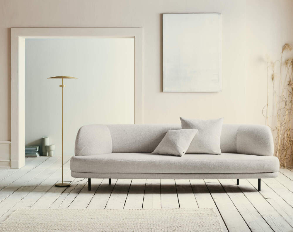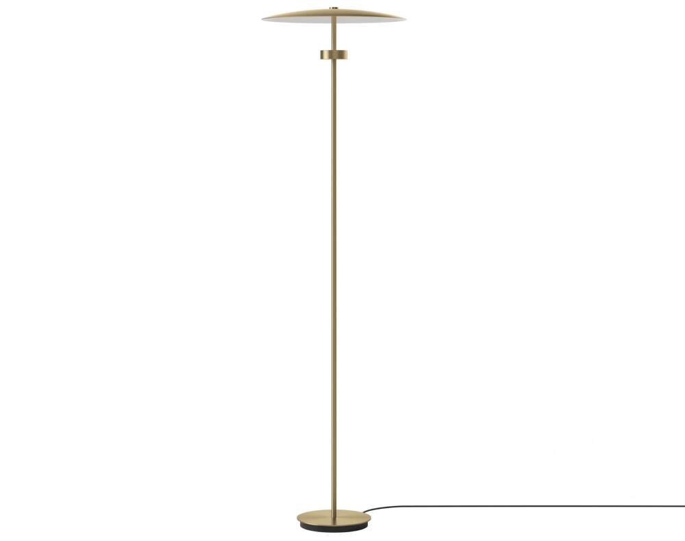 Minimalistická stojací lampa Reflection, kterou pro dánskou značku Bolia navrhnul Asger Risborg Jakobsen. Provedení: zlatě lakovaný hliník.