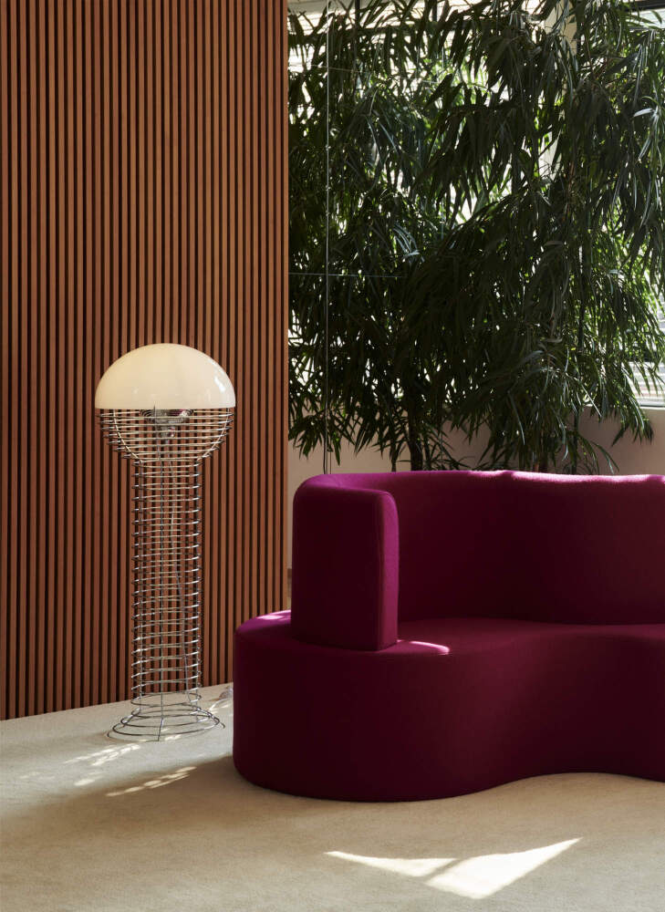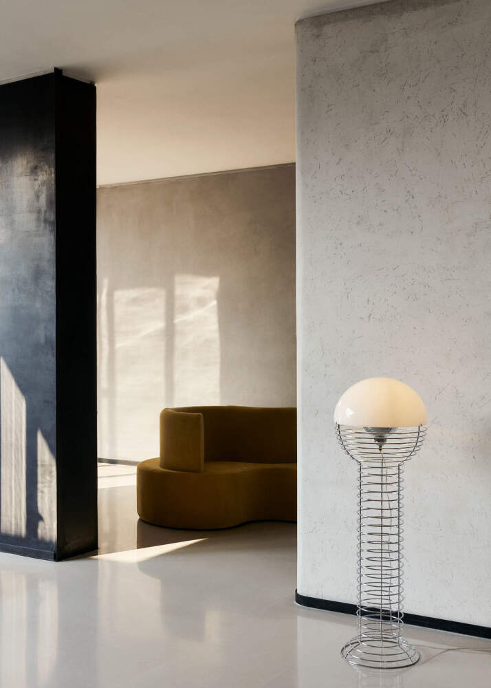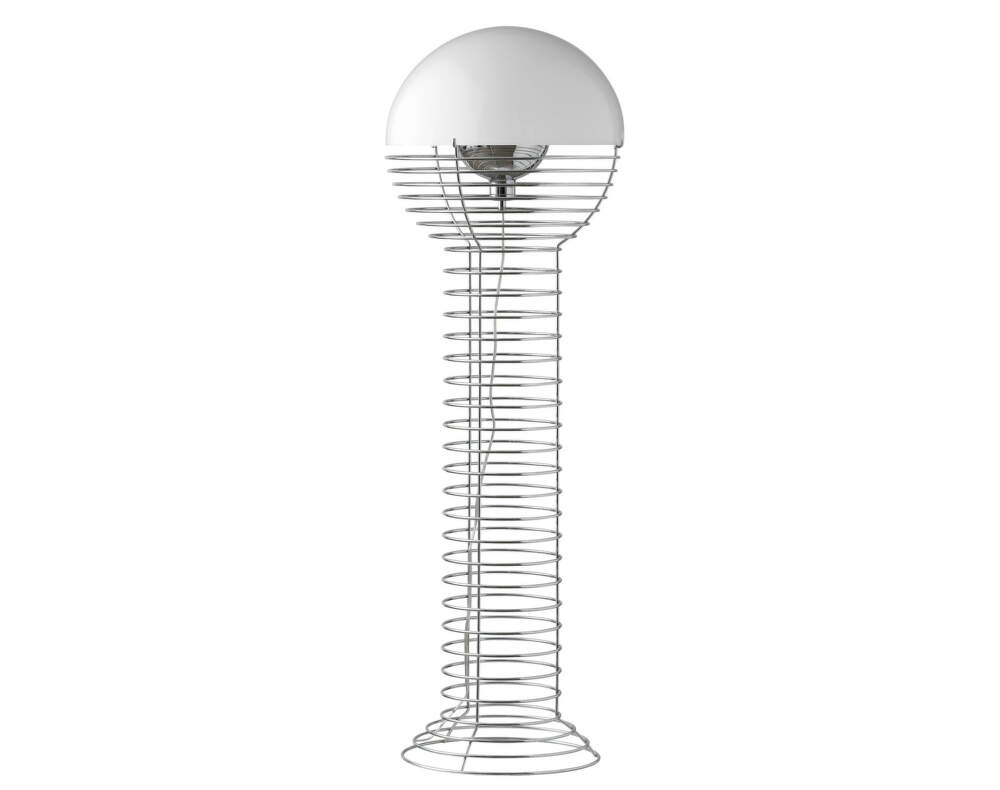 Stojací lampa Wire patří k ikonickým návrhům Vernera Pantona z počátku 70. let a představuje experiment s ocelovým drátem v jeho nejčistší podobě. Otevřená konstrukce z pochromovaného drátu vytváří lehkou a geometricky přesnou siluetu. Světlo zde není pouze funkčním prvkem, ale stává se hlavním aktérem prostoru.