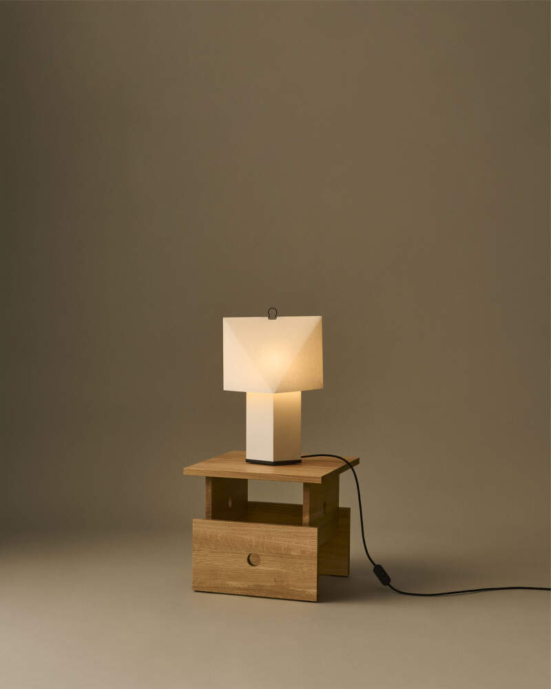 Stolní lampa Aplat pracuje s jednoduchým principem skládání papíru, který dává vzniknout lehké, ale výrazné formě. Papírové stínítko je tvarováno do přesných linií a úhlů, díky nimž působí zajímavě a elegantně.