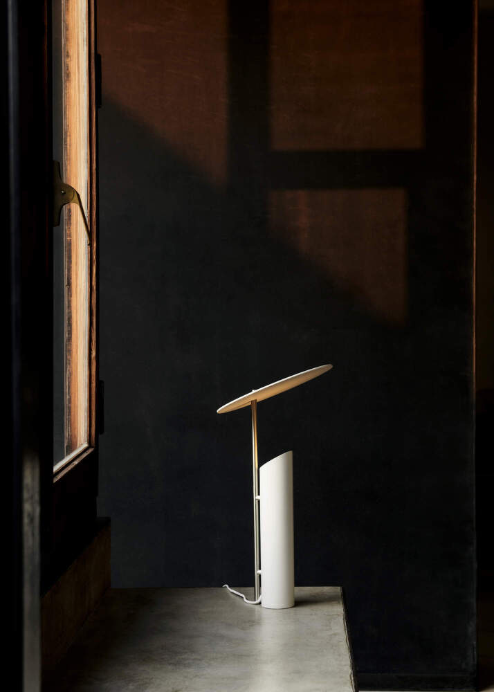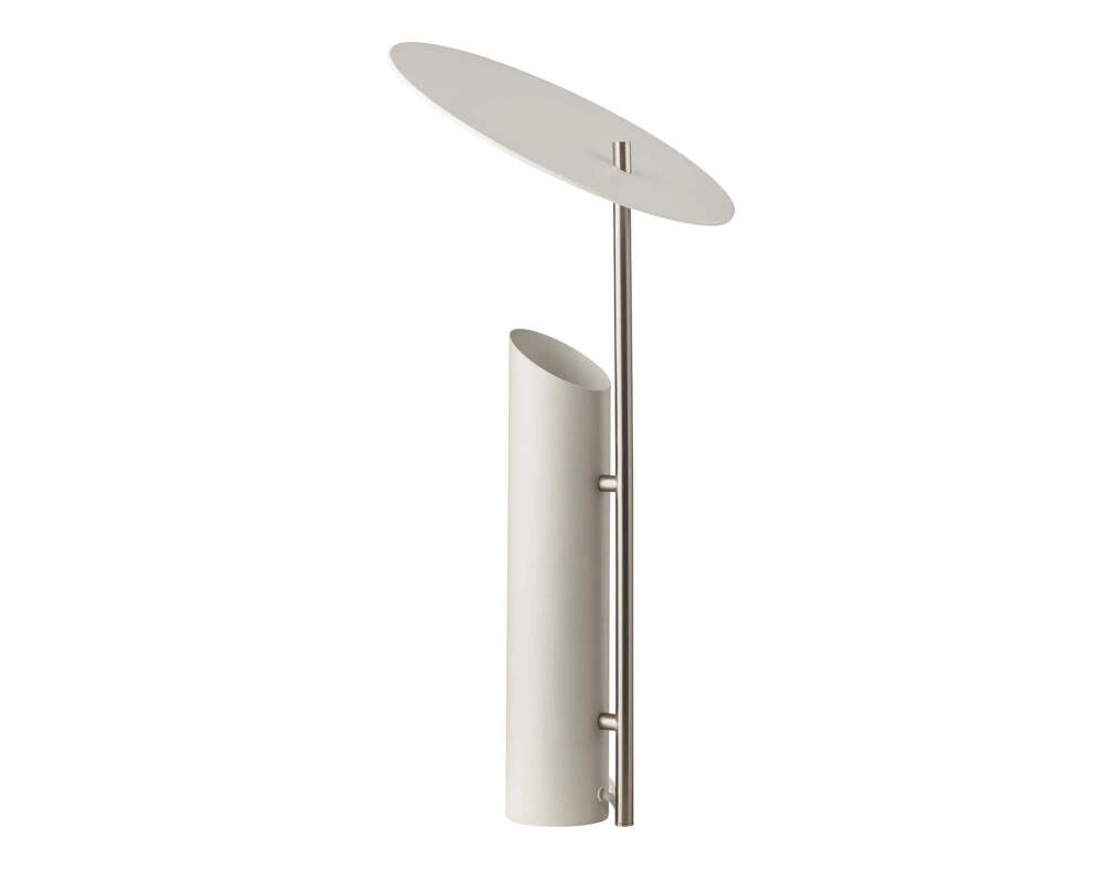 Světlo vychází z trubkové základny směrem vzhůru a dopadá na bílý povrch stínítka, odkud se měkce rozptyluje do okolí. Všechny části lampy jsou vyrobeny z oceli s práškově lakovanou povrchovou úpravou, svislá tyč má saténový finiš.
