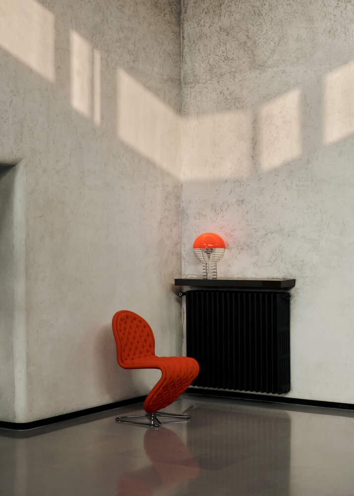 Stolní lampa Wire patří k ikonickým návrhům Vernera Pantona z počátku 70. let a představuje experiment s ocelovým drátem v jeho nejčistší podobě. Otevřená konstrukce z pochromovaného drátu vytváří lehkou a geometricky přesnou siluetu. Světlo zde není pouze funkčním prvkem, ale stává se hlavním aktérem prostoru.