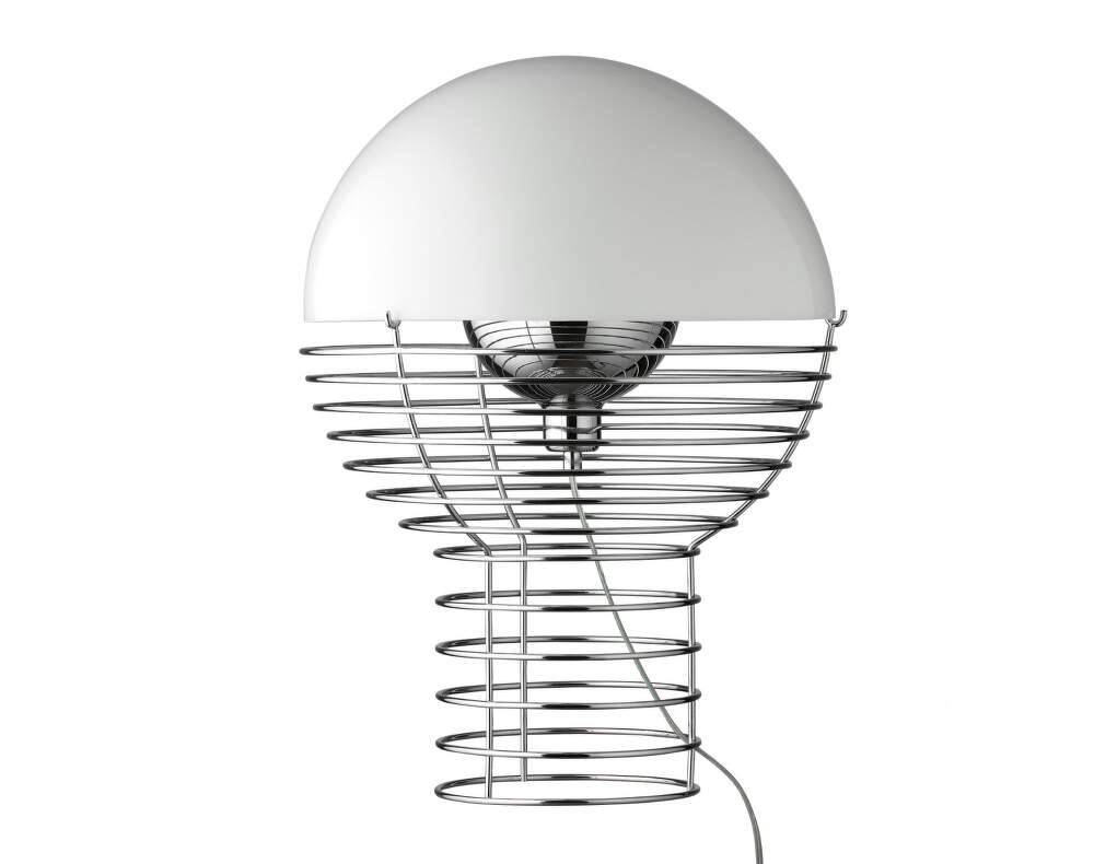Stolní lampa Wire patří k ikonickým návrhům Vernera Pantona z počátku 70. let a představuje experiment s ocelovým drátem v jeho nejčistší podobě. Otevřená konstrukce z pochromovaného drátu vytváří lehkou a geometricky přesnou siluetu. Světlo zde není pouze funkčním prvkem, ale stává se hlavním aktérem prostoru.