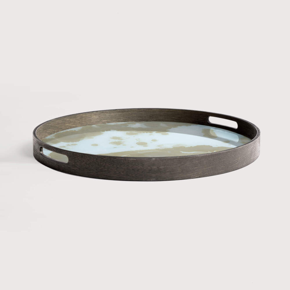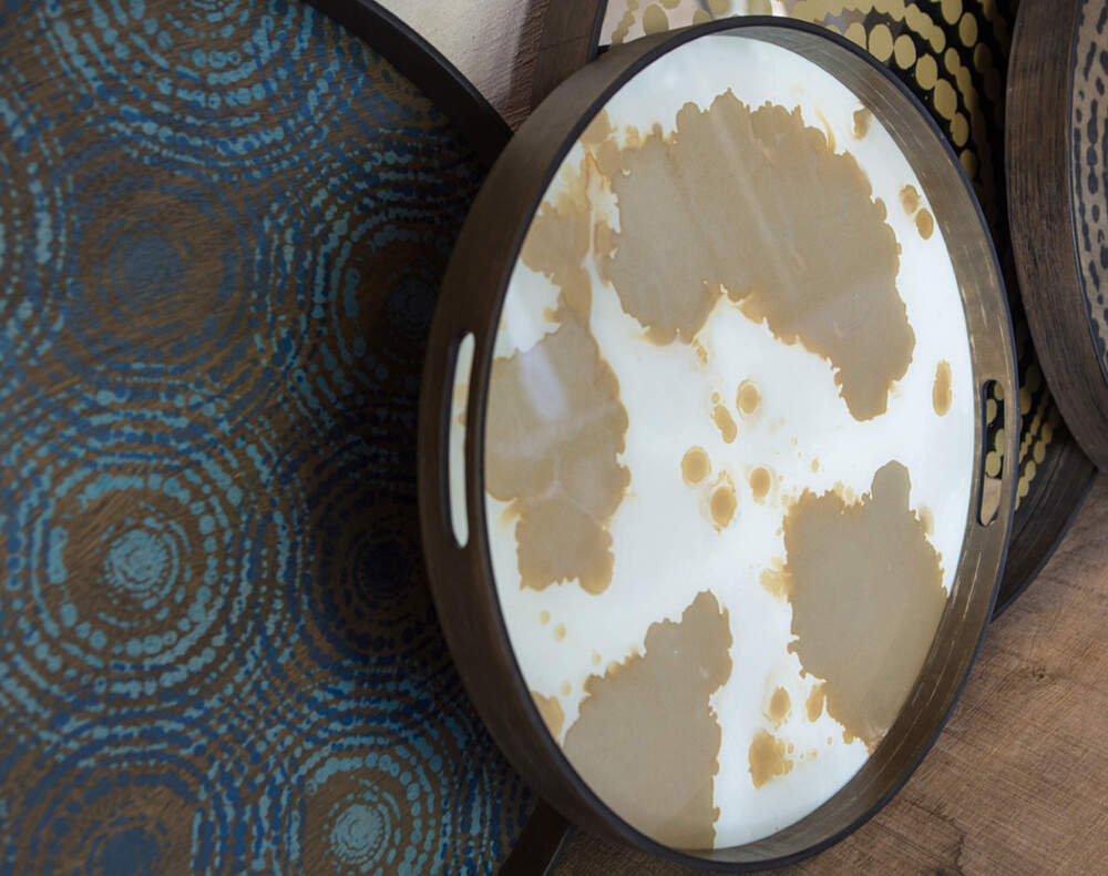 Skleněný podnos je zdoben sítotiskovým motivem s kombinací průhledných a neprůhledných vrstev, které dodávají dekoru hloubku a zvýrazňují zlaté detaily. Podnosy byly navrženy designérkou Dawn Sweitzer tak, aby báječně ladily ke stolkům i ostatním tácům Tray.