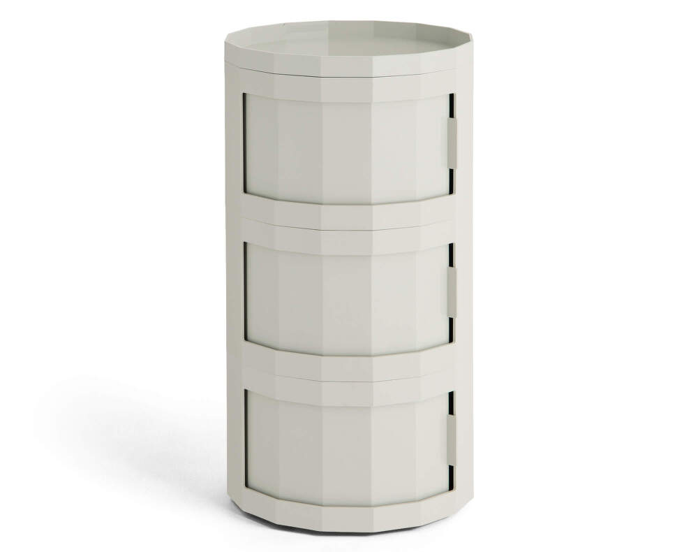 Vyšší multifunkční stolek Facet Cabinet 30 se třemi dvířky, který pro dánskou značku HAY navrhnul nizozemský designér Stefan Scholten. Barva: světle šedá.