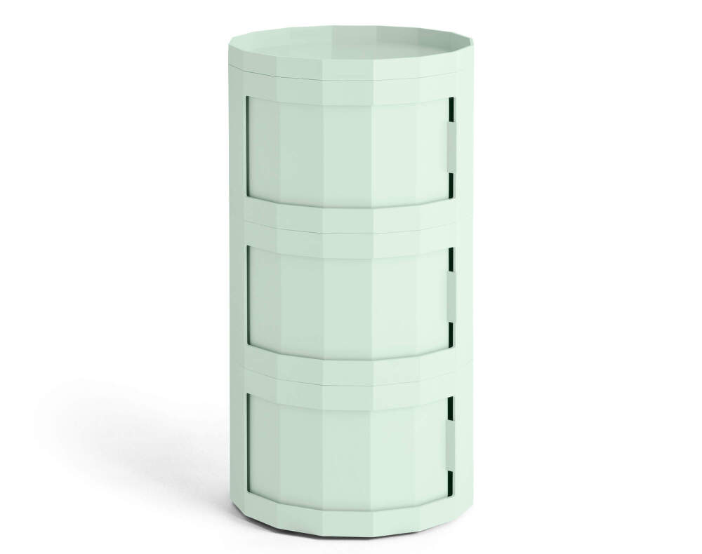 Vyšší multifunkční stolek Facet Cabinet 30 se třemi dvířky, který pro dánskou značku HAY navrhnul nizozemský designér Stefan Scholten. Barva: světle mintová.