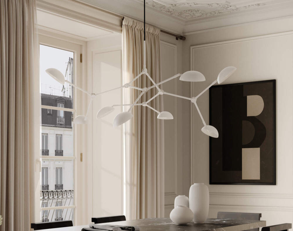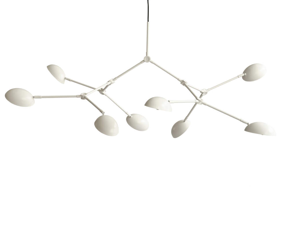 Závěsné svítidlo Drop Big v bílém provedení přináší do interiéru jemnou nenápadnou světelnou kompozici, která propojuje modernistickou estetiku s hravou variabilitou. Organicky tvarovaná stínítka, inspirovaná designem 50. let 20. století, působí lehce a vzdušně, zatímco 14 nastavitelných ramen umožňuje upravit směr světla i celkový výraz svítidla. Je možné vytvořit variace tvarů, od symetrických kompozic až po hravě asymetrické uspořádání.