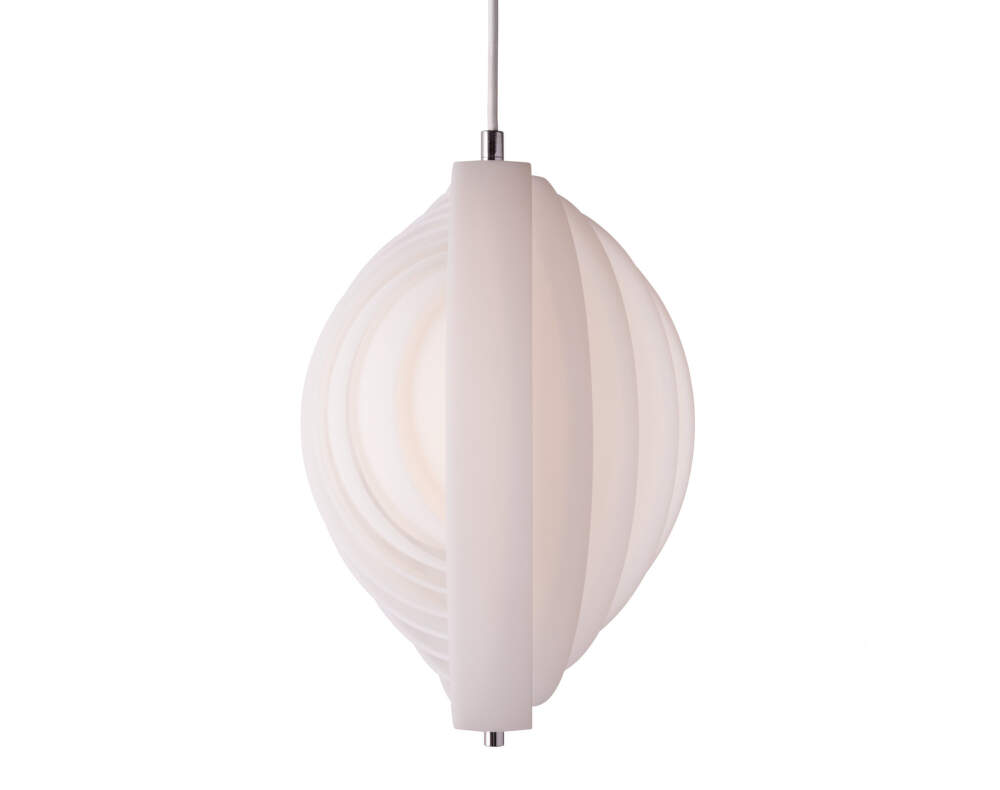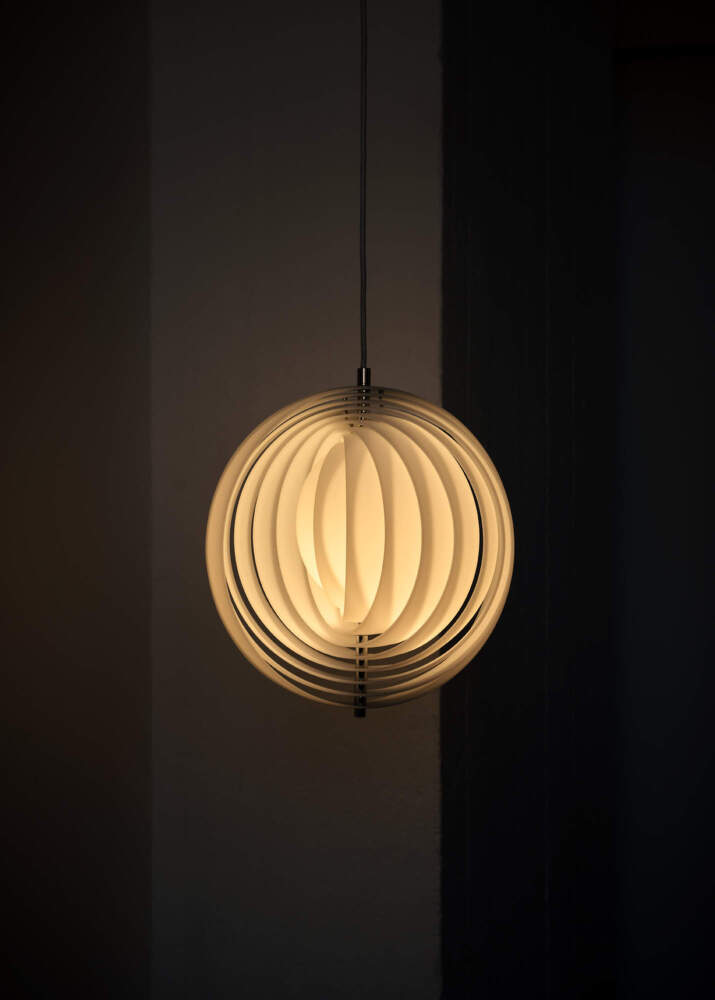 Závěsné svítidlo Moon vychází z raného návrhu Vernera Pantona z roku 1960 a představuje jednu z nejčistších ukázek jeho práce se světlem jako s formotvorným prvkem. Charakteristické vějířovité uspořádání deseti kruhových lamel vytváří dynamickou siluetu, která se proměňuje podle úhlu pohledu a dodává prostoru vizuální hloubku.