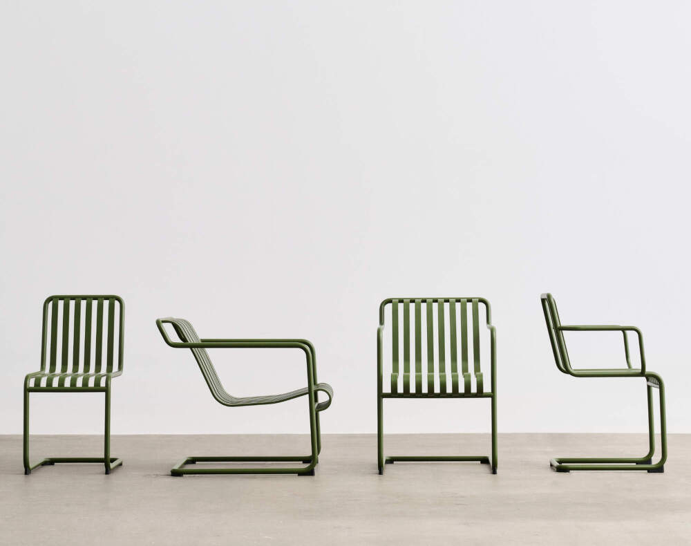 Ocelová židle Palissade Cantilever z kolekce moderního venkovního nábytku, kterou pro dánskou značku HAY navrhl Ronan Bouroullec. Barva: olivová.